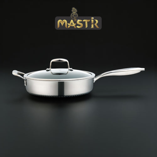 Mastir Stainless Steel Deep Sauté Pan/Shallow Fry Pan with Glass Lid – Hybrid Honeycomb Nonstick, PFOA-Free & EU Approved – Stay-Cool Handle, Induction & Oven Safe, Dishwasher Safe – 26/28 cm