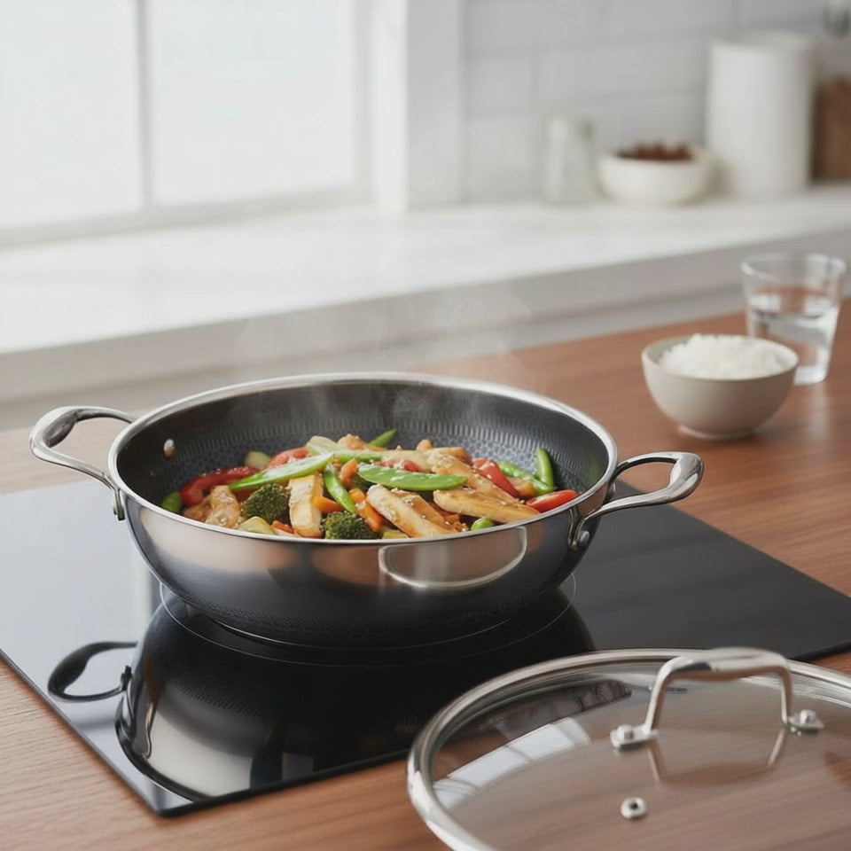 Mastir Stainless Steel Wok with Tempered Glass Lid – Hybrid Honeycomb Nonstick, PFOA-Free & EU Approved – One Long Handle + Helper Ear Handle, Induction & Oven Safe, Dishwasher Safe – 28/30 cm